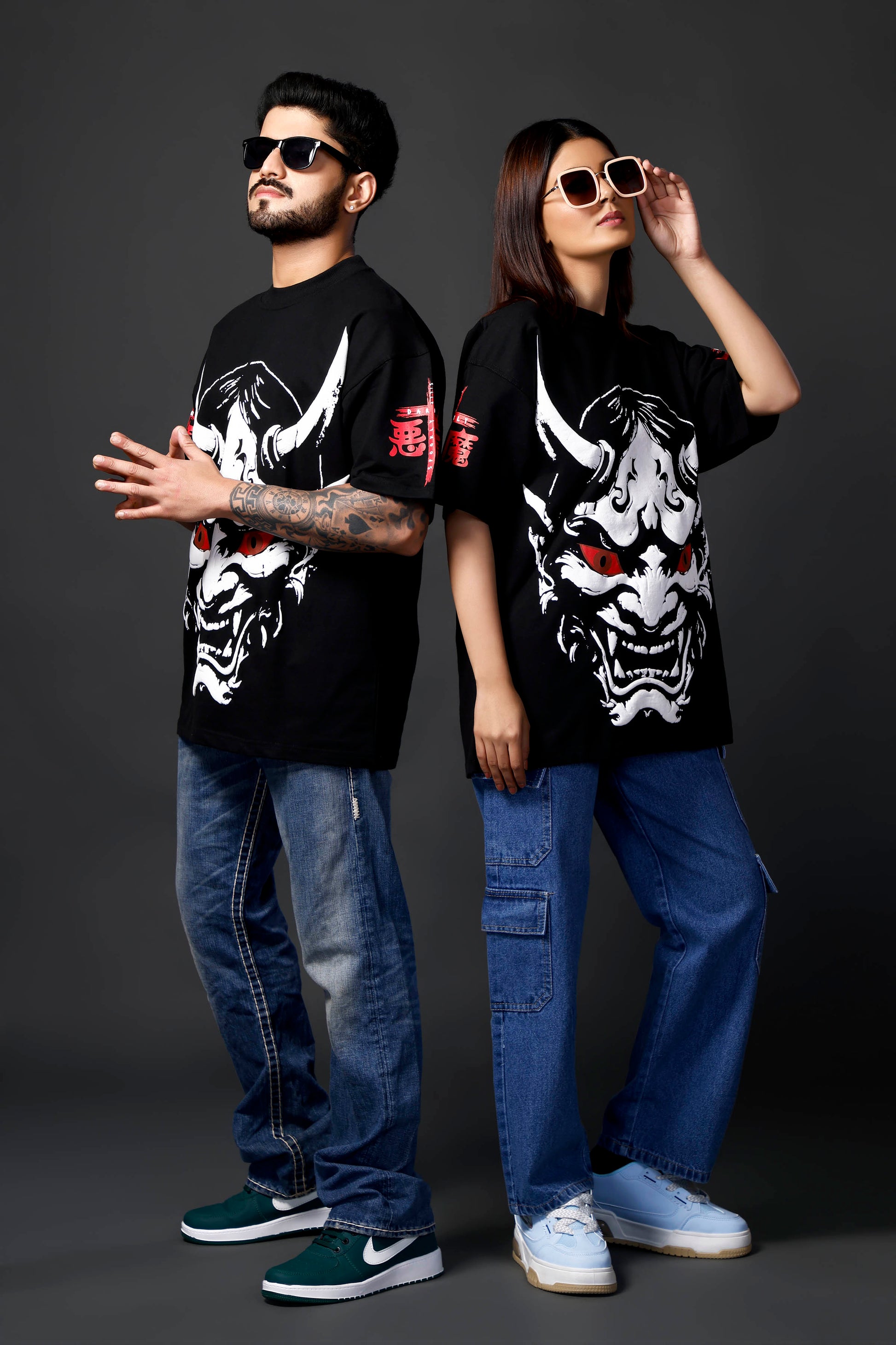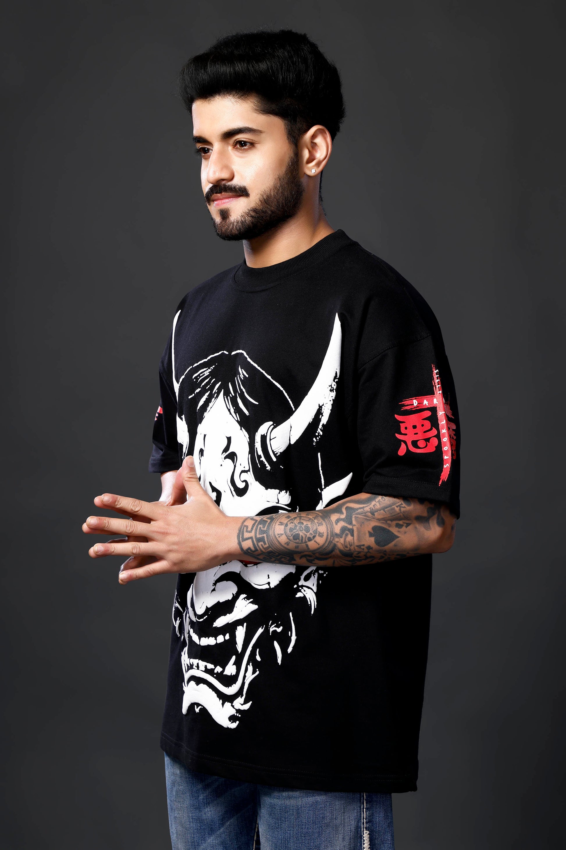Unleash your darker side with the Akuma Oversized T-Shirt from GothicToons. Featuring a bold HD puff print of a devil face on the front and elegant Japanese kanji running down the side, this shirt delivers striking visual power with cultural edge.