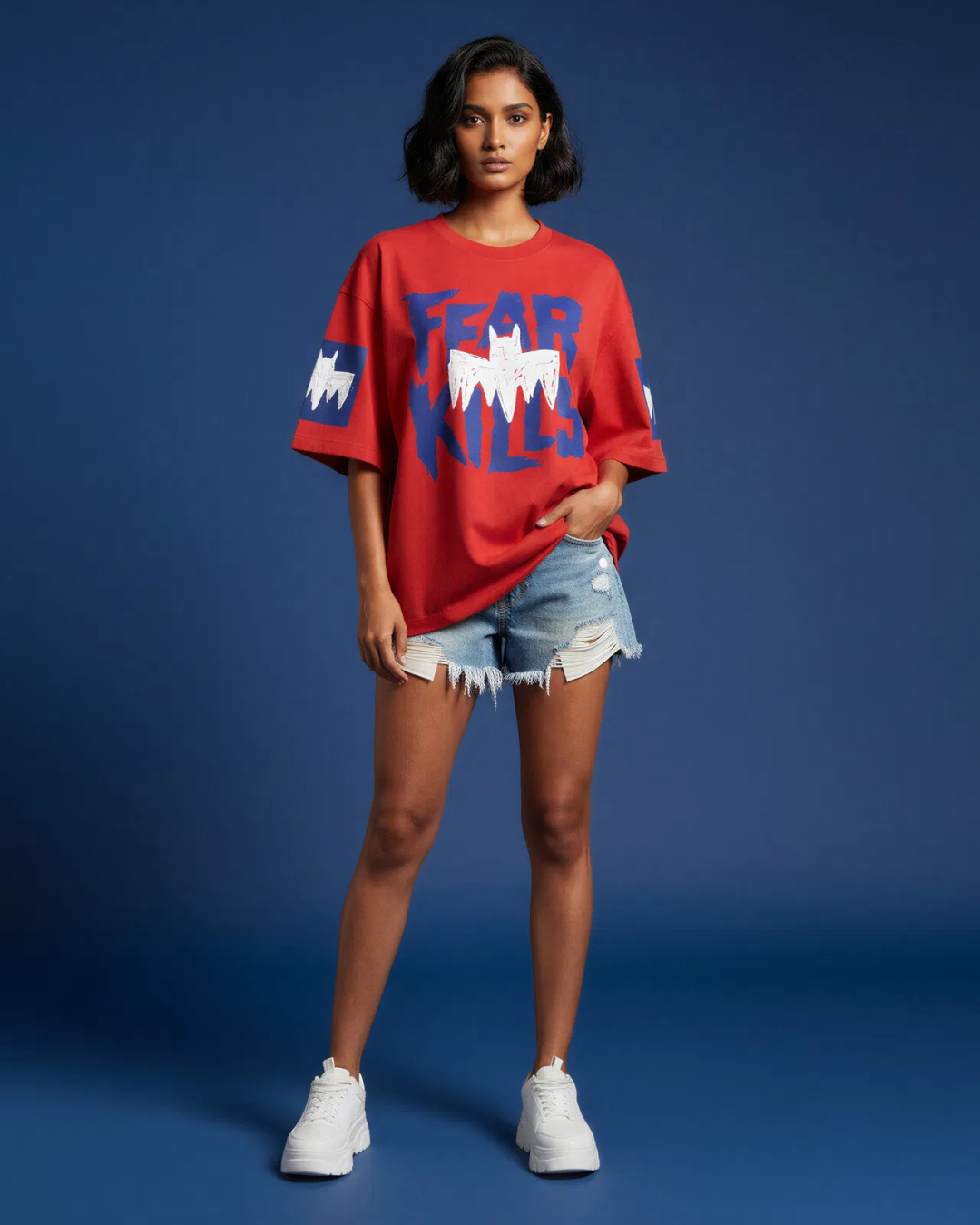 FEAR KILLS is cut in blood-red 260 GSM French terry — heavy, grounded, unapologetic. Built to feel like armor, not fabric. The weight reminds you you’re still here. Still standing.