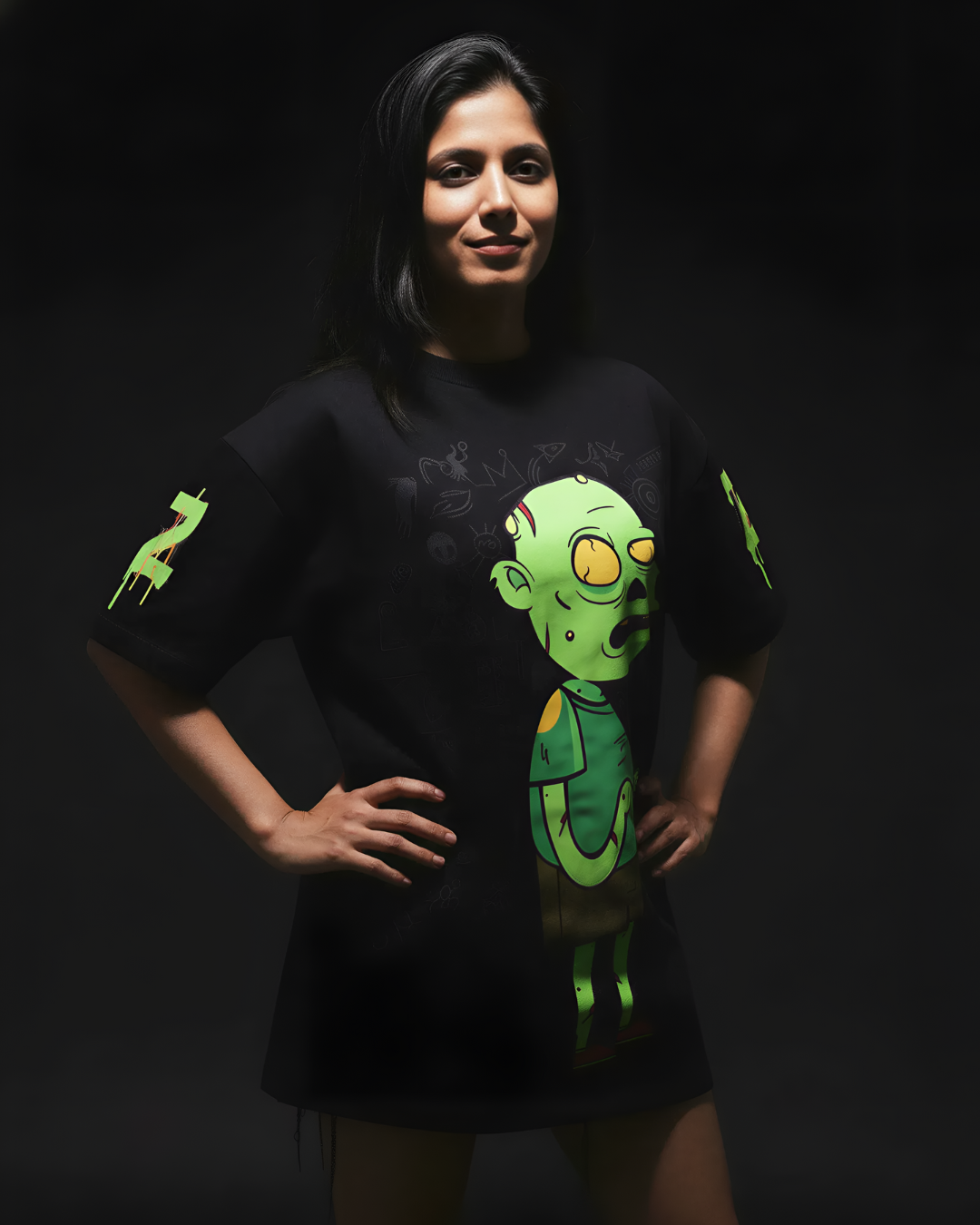 Let chaos reign with the Zomkid Oversized T-Shirt. A massive zombie takes center stage, surrounded by messy, bold gothic doodles that scream individuality and defiance. This tee is raw, edgy, and unapologetically undead.